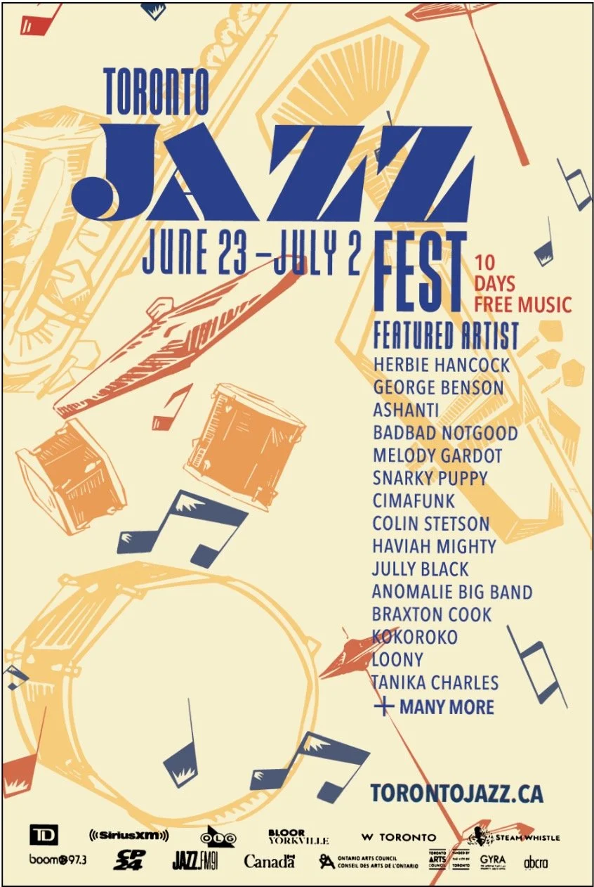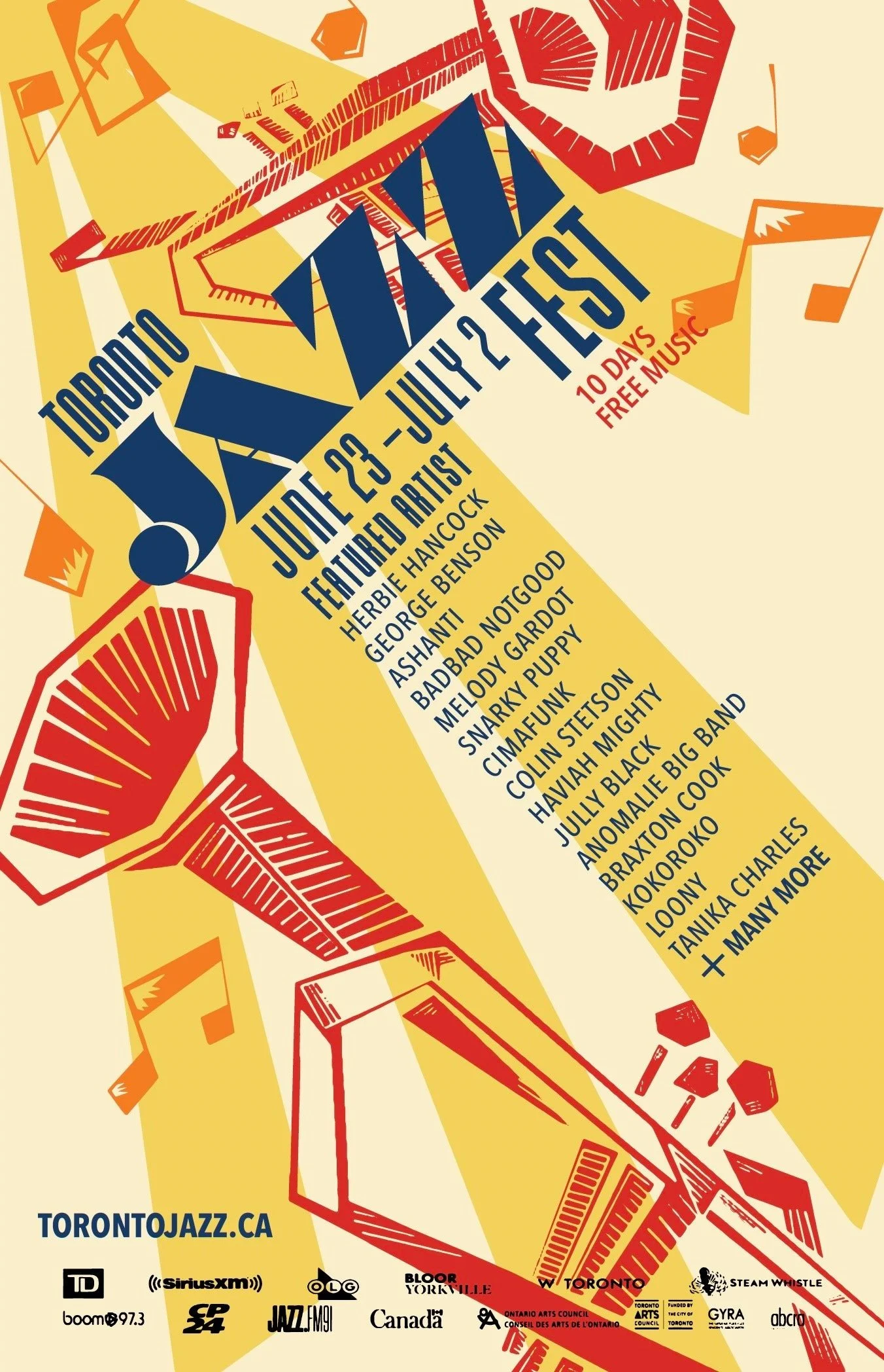 For the Toronto Jazz Festival posters, I chose the colors to match jazz's upbeat, energetic feel. There is a lot of movement in the background, so the typography is grouped together to contrast that.